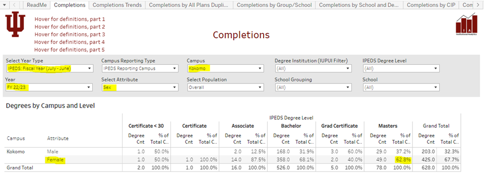 62.8% of all master’s degrees awarded at IU Kokomo in FY 22/23 were earned by female students.